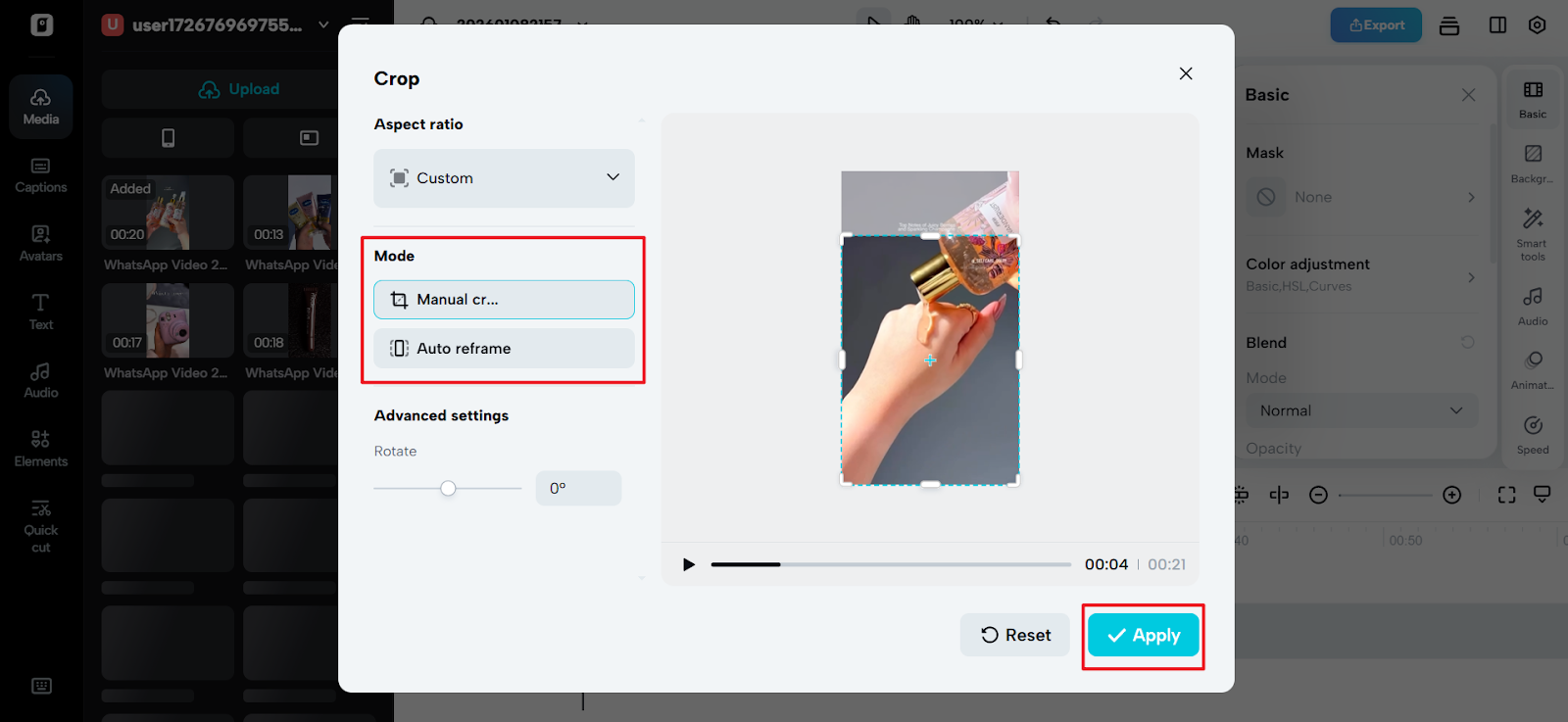 In the editor, go to the Smart Tools option and select the Auto Reframe option. Decide on your preferred aspect ratio. Select the Manual Crop option or the Auto Reframe option. Click the Apply option. Understand that the portion needing reframing will automatically exclude the text.