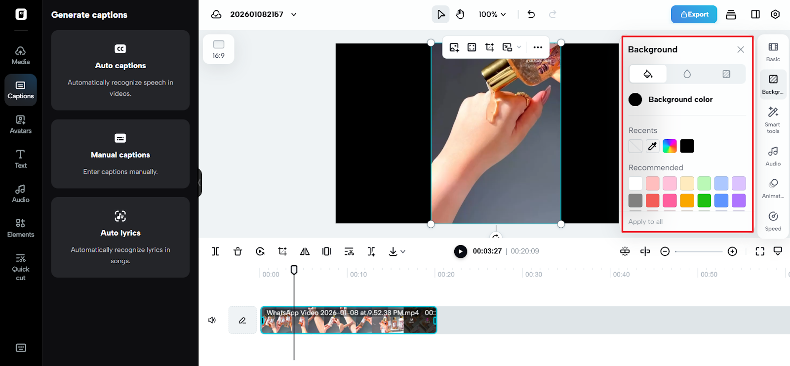 To remove videos featuring text placed over a background image or color, click Remove Background and turn off Auto Removal. Now that the background is removed, click Background to introduce a new color or Elements to position images.
